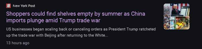 这里值得一提的是,美国《纽约邮报》在当地时间4月21日发表的一篇报道中还透露了一个会加重美国人对经济前情担忧的情况,即在美国政府关税的影响下,将于今年5月4日到10日抵达美国加州洛杉矶和长滩港口的中国货物集装箱,已经较去年同期下降了43%。尽管今年4月20日至26日抵达两个港口的中国货物集装箱,较同期出现了57%的增加——甚至在4月2日到9日这周还出现了较同期145%的增加,但该报采访的经济学家认为,这种恐慌性的进货与5月抵港数据的显著下跌,反而交织出了一个相当悲观的前景:美国的消费者将在未来数周内迎来多种消费品的短缺问题,以及这将导致的物价进一步的上涨、更多就业岗位的消失。