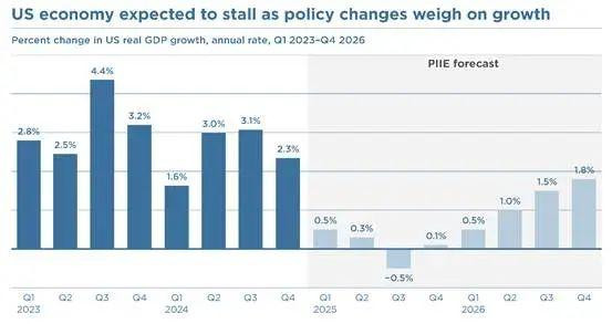 而且,两篇文章接下来还都提到了美国政府的破坏性政策对其自身的损害,尤其是美国的经济增长很可能会在今年迎来停滞。彼得森国际经济研究所就认为美国2025年的GDP增长将从前一年2.5%的年度增长速率,直接跌到0.1%——甚至在今年第三季度还会出现负增长。而美国在未来12个月经济出现衰退的概率,目前已经达到了40%。