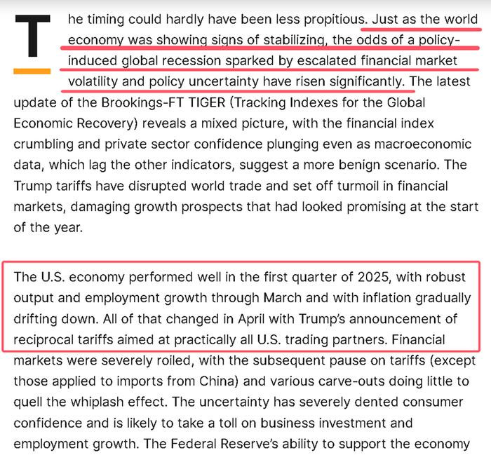 从中可以看到,两篇文章在开篇都表达了全球经济本来在一季度正迎来复苏和好转,但随着美国政府自今年4月对全球贸易砸下关税大棒,再加上白宫说变就变的相关政策,不仅直接扰乱了全球的供应链,还给市场制造了大量的不确定性,这极大地伤害了消费者和投资人的信心,从而令今年原本乐观的经济预期,一下子恶化了起来。